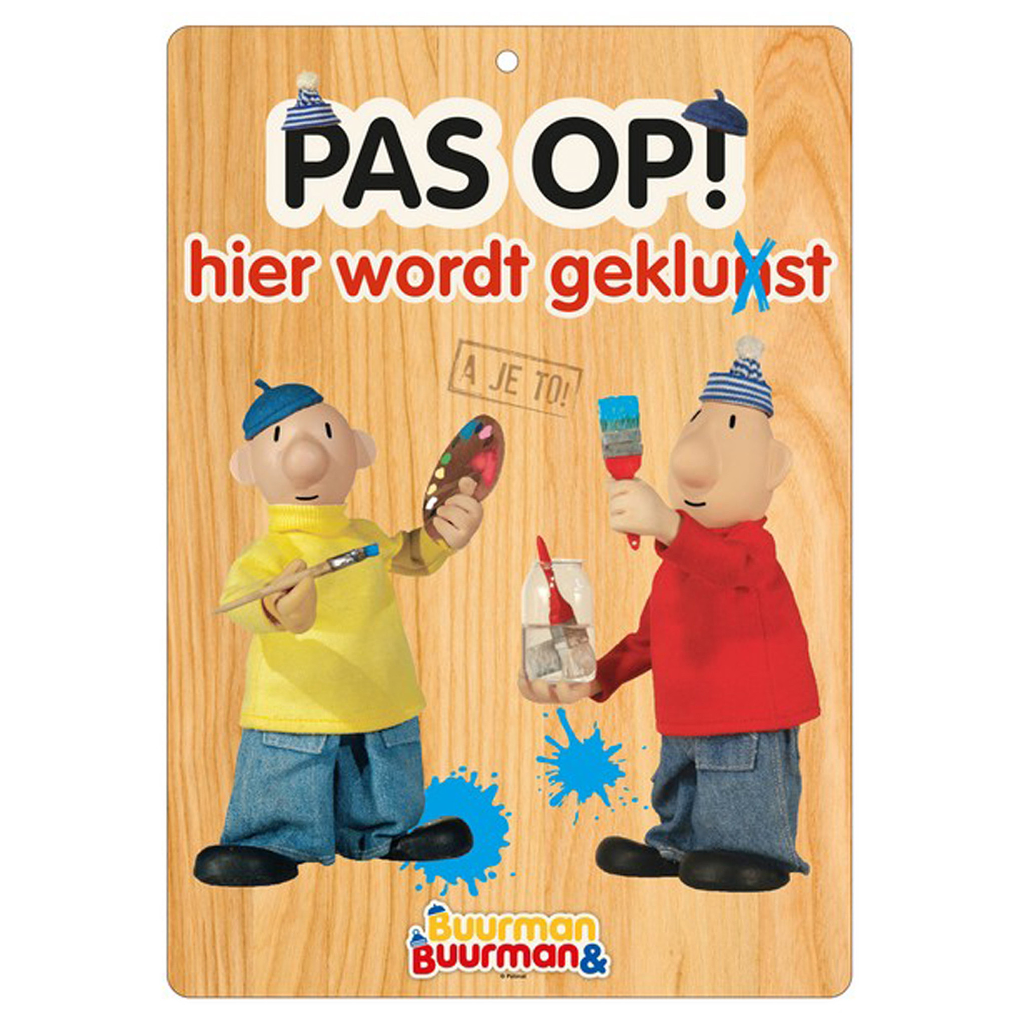 Het bord is gemaakt van blik met een afbeelding van Buurman & Buurman die aan het schilderen zijn.